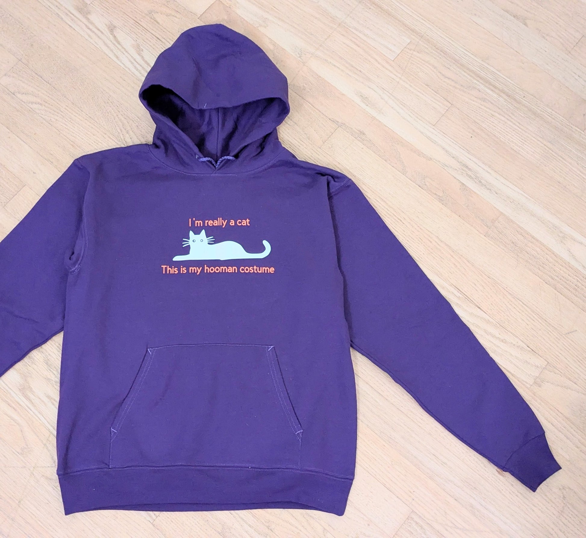 New and improved: The Hooman Costume! Wear this adorable hoodie to declare your true identity - 100% CAT. Now available in purrple (white cat) or orange (black cat). As always, 20% of every order benefits shelter cats around the world!